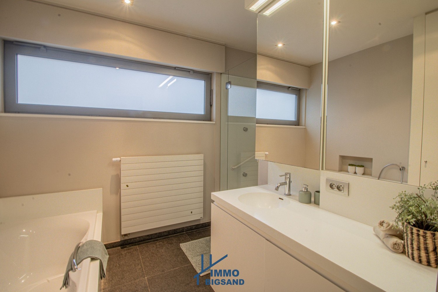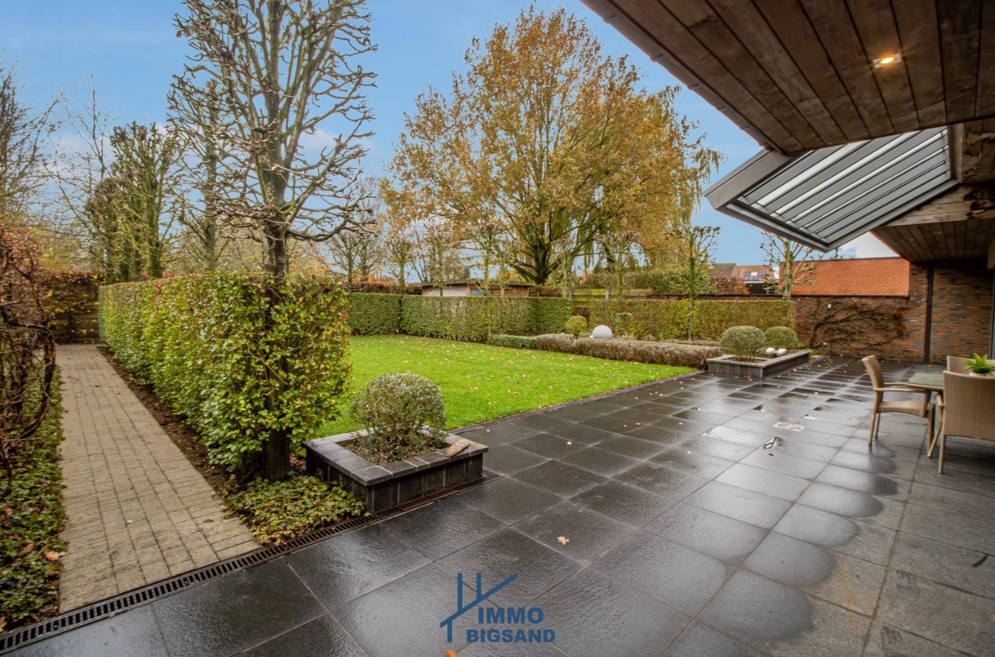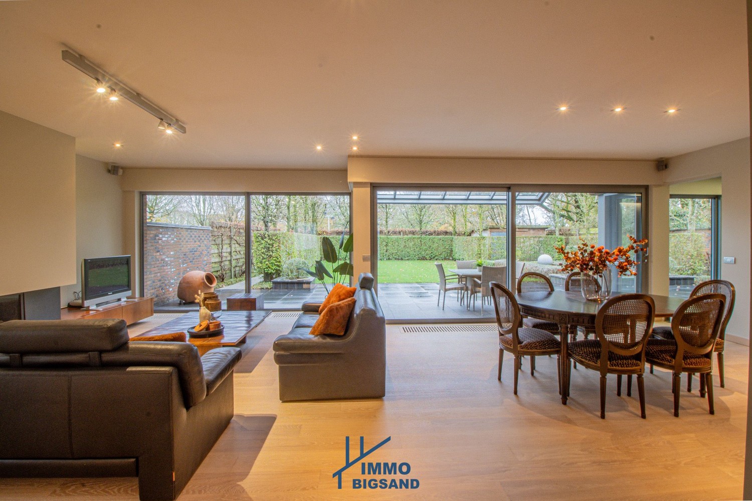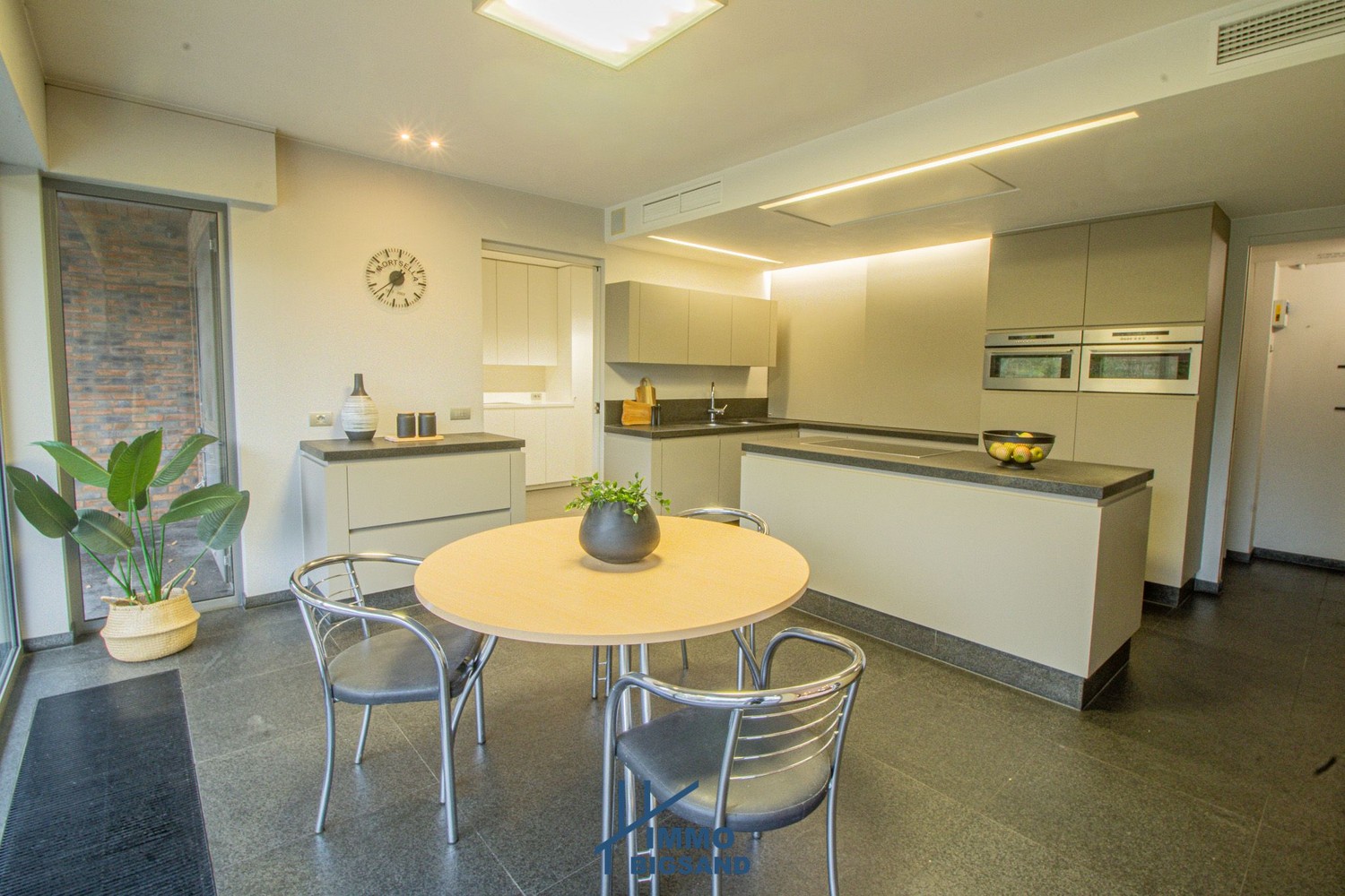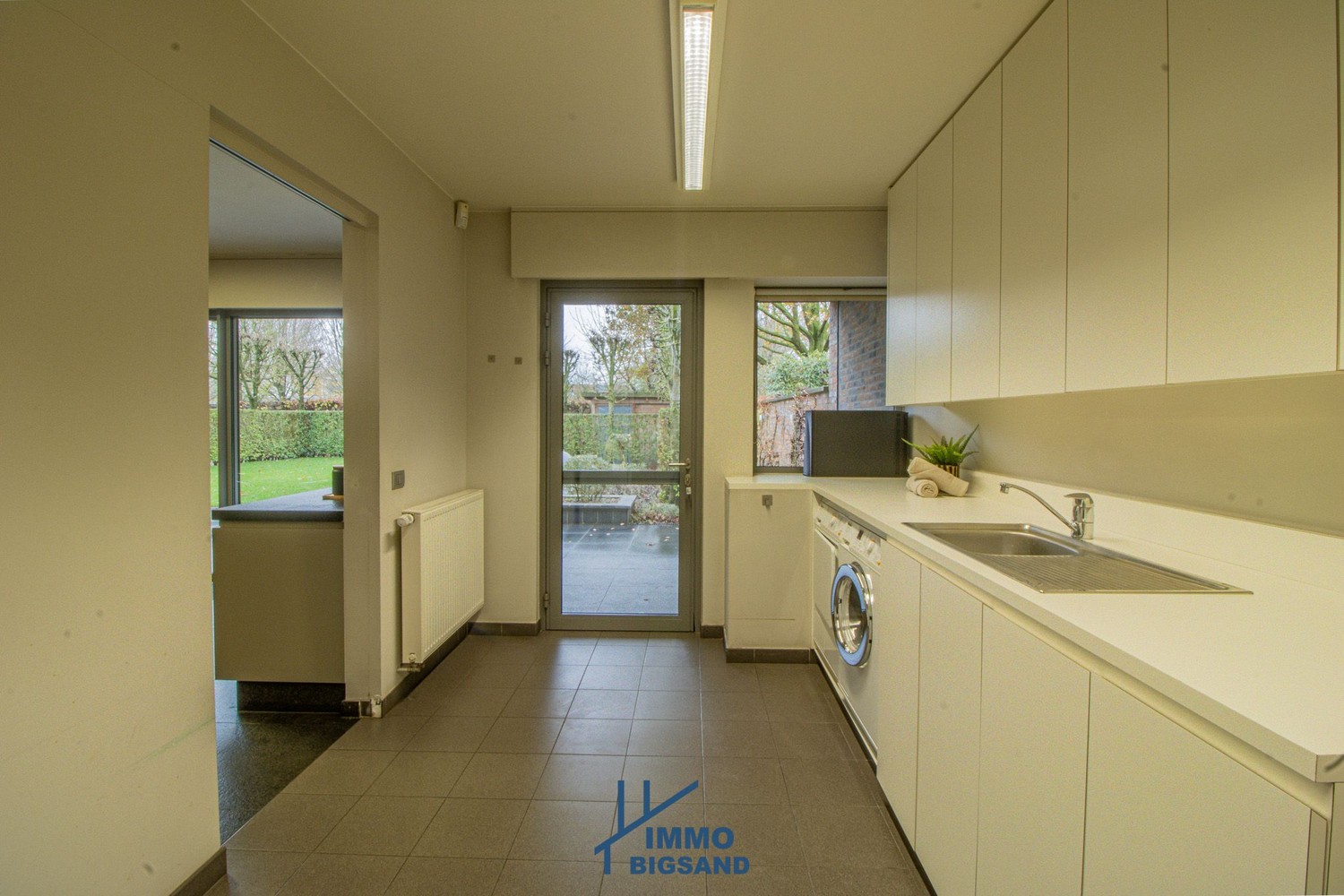 Bij het binnenkomen valt meteen de lichtrijke leefruimte op, die naadloos overgaat in de keuken. Vanuit zowel leefruimte als keuken geniet u van een prachtig zicht op de tuin. Aansluitend bevindt zich een praktische wasplaats met rechtstreekse toegang tot zowel de tuin als de garage. Overal werd deze woning ook voorzien van elektrische rolluiken.