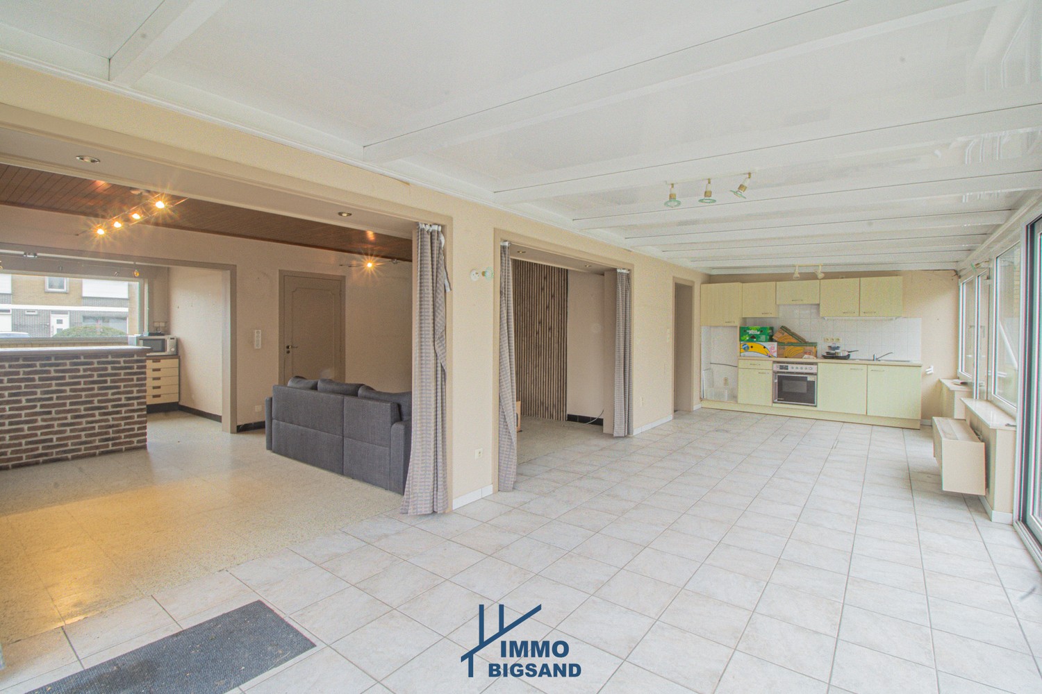 Bij het betreden van de woning kom je in de inkomhal met gastentoilet. Aansluitend bevinden zich de woonkamer en keuken. De woning werd bovendien uitgebreid met een veranda over de volledige breedte, wat zorgt voor een aanzienlijke uitbreiding van de leefruimte. Deze veranda is lichtrijk en vormt een mooie verbinding met de tuin. Aansluitend is er ook een praktische bijkeuken.