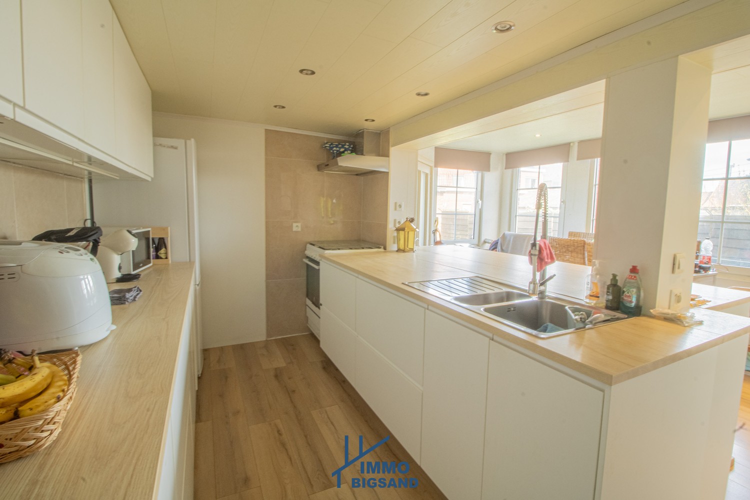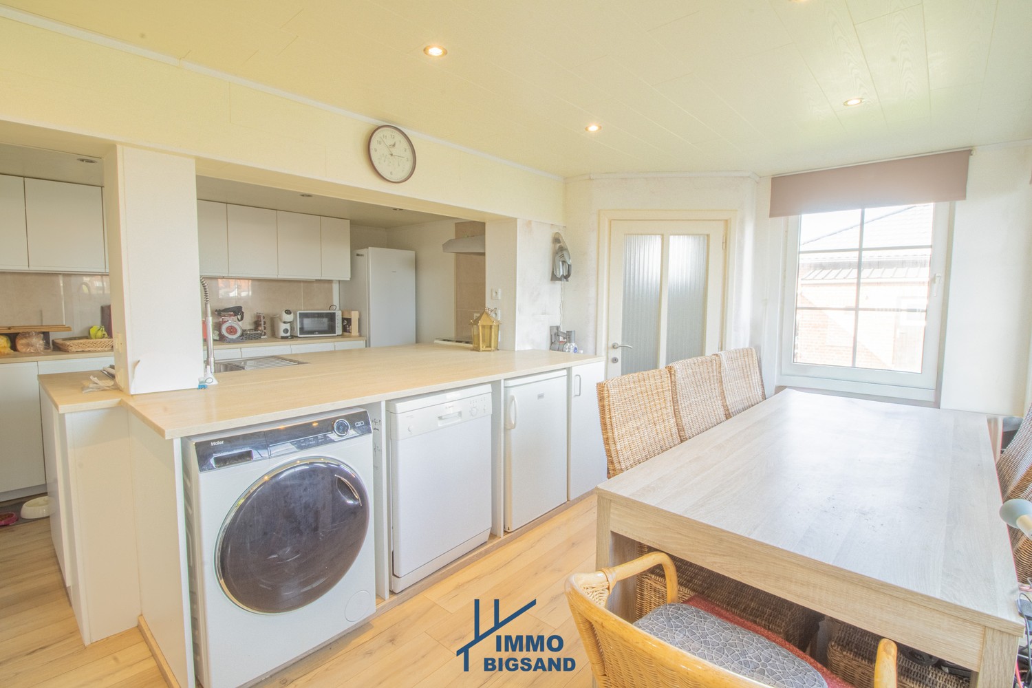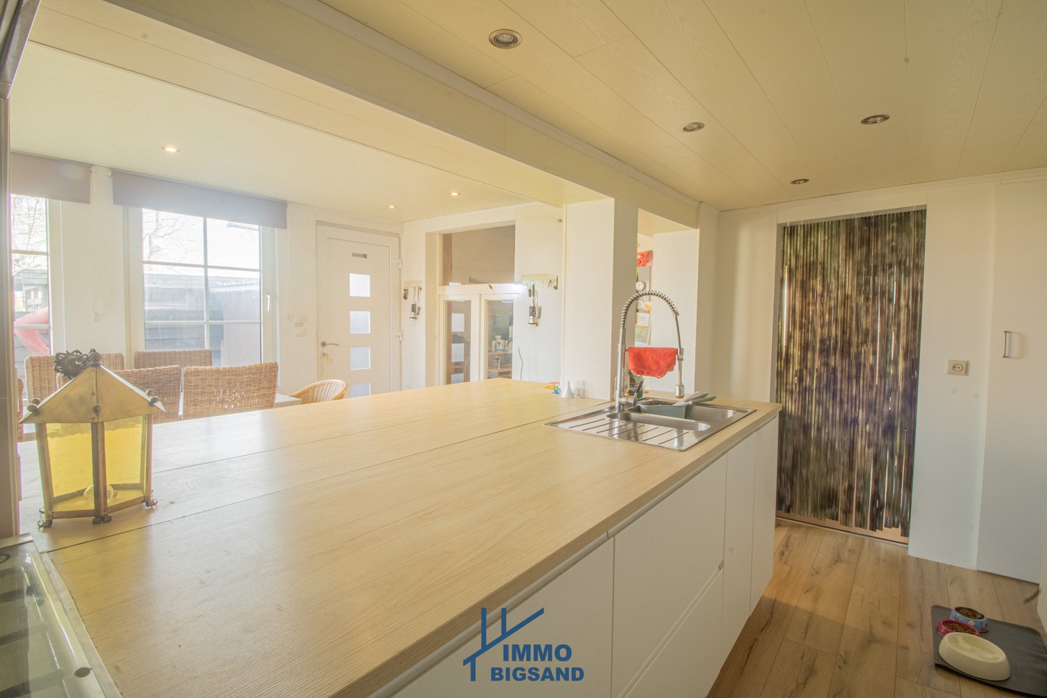 Achteraan de woning werd een uitbouw met geïsoleerd plat dak gerealiseerd waar zich de volledig uitgeruste keuken bevindt. Deze ruimte geniet van een aangenaam zicht op de tuin en vormt een mooie verbinding met het buitenleven.
