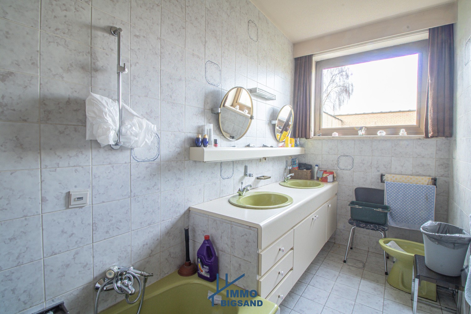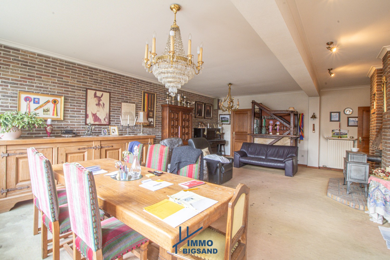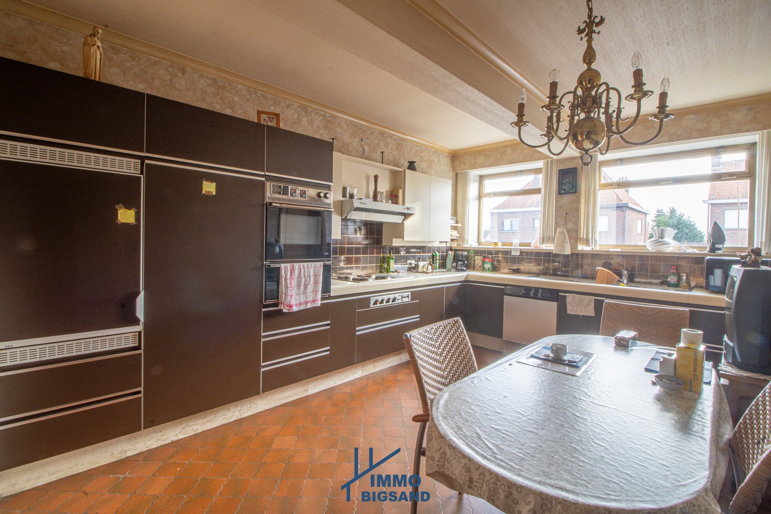 Gelijkvloers appartement te koop van maar liefst 160m². Dit appartement met inkomhal en gastentoilet, ruim woonkamer met open haard, leefkeuken met aansluitende bergplaats en wasruimte, 3 slaapkamers, badkamer (ligbad, dubbel lavabomeubel en bidet). EPC is een E. Verwarming op stookolie. Mogelijkheid tot het aankopen van een garage (bereikbaar langs het gebouw voor circa 23 000 EURO). Het gebouw zelf is van 1975. Zie ook advertentie waarbij het appartementsblok wordt verkocht met alle garages voor circa 399 000 EURO (perceel van 777m²) + appartement hierboven apart + projectgrond hiernaast ( zie zoekertjes op www.immobigsand.be )