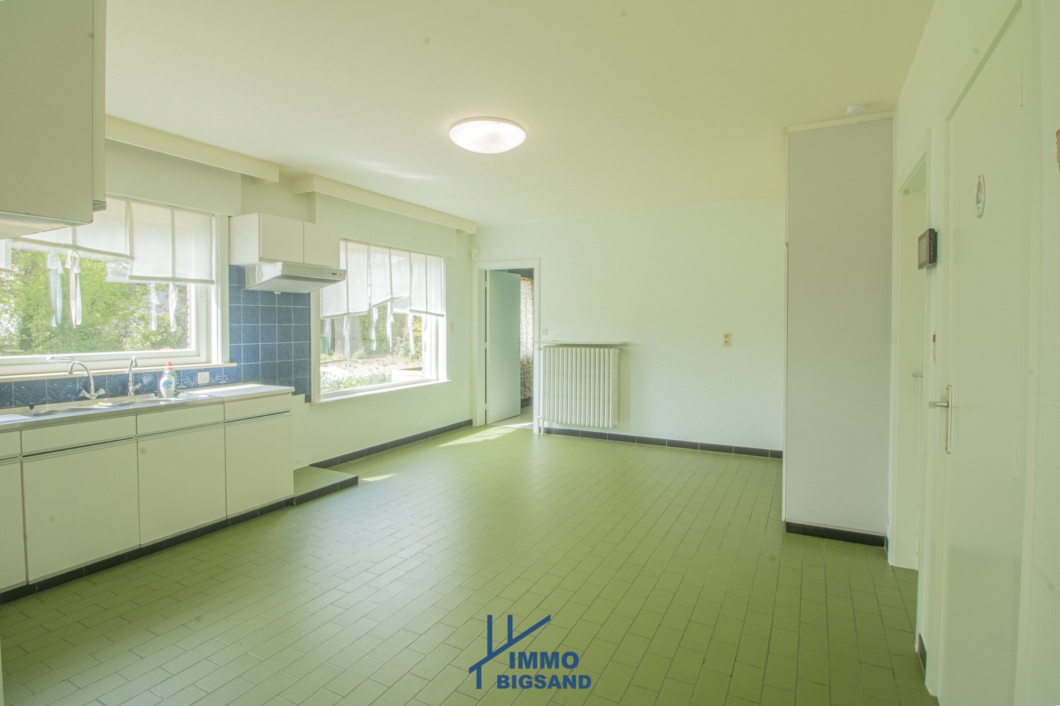 Aansluitend bevindt zich de bijzonder ruime keuken met zicht op de tuin, die doorloopt naar de technische ruimte met de centrale verwarmingsinstallatie.
